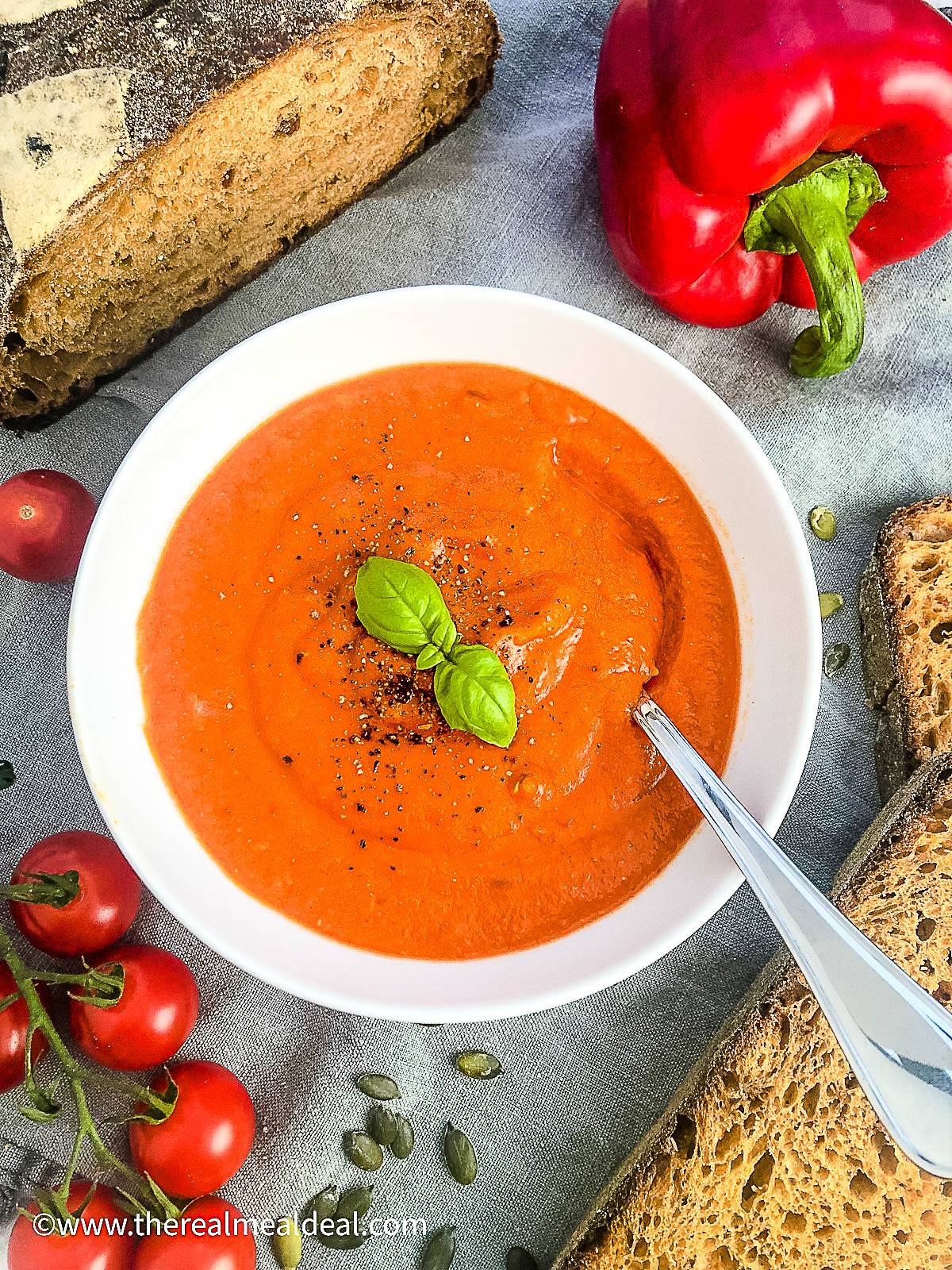 A roasted red pepper and lentil soup is a delicious filling and healthy soup perfect for any time of the year. Use up any leftover red peppers from your chilli.